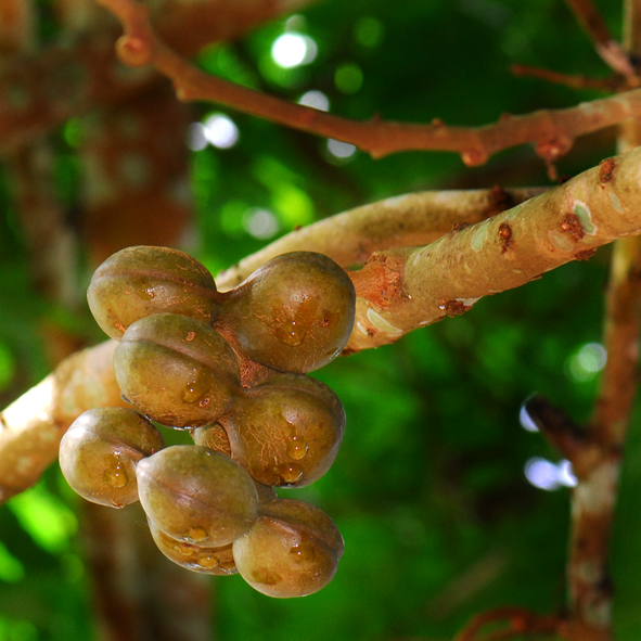 - ใบ ช่อใบประกอบ 1 คู่ ยาวได้ถึง 20 ซม. มีใบย่อย 2-3 คู่ ออกตรงข้าม กว้าง 3-7 ซม. ยาว 6-20 ซม. รูปไข่ถึงรูปรีหรือขอบขนาน ปลายเรียวสั้้น โคนทูู่หรือกลม ค่อนข้างเบี้ยว ยอดอ่อนสีม่วง ห้อยแกว่ง ใบแก่บางคล้ายกระดาษ เกลี้ยงทั้งสองด้าน เส้นใบ 6-10 คู่ ไม่ขนานกัน โค้งและเชื่อมกัน นูนด้านบน ก้านใบย่อยยาว 4-6 มม. แกนกลางใบยาว 2-7 ซม. เกลี้ยง มีต่อมกลมขนาด 2 มม. ใกล้โคนและที่ยอด (เห็นชัดใบยอดอ่อน) และมักมีต่อมเล็กกว่าระหว่างคู่ใบด้านบน กิ่งสีน้ำตาลอ่อน เกลี้ยงกลมเมื่อตัดขวาง มีสันตื้นใต้รอยแผลใบ