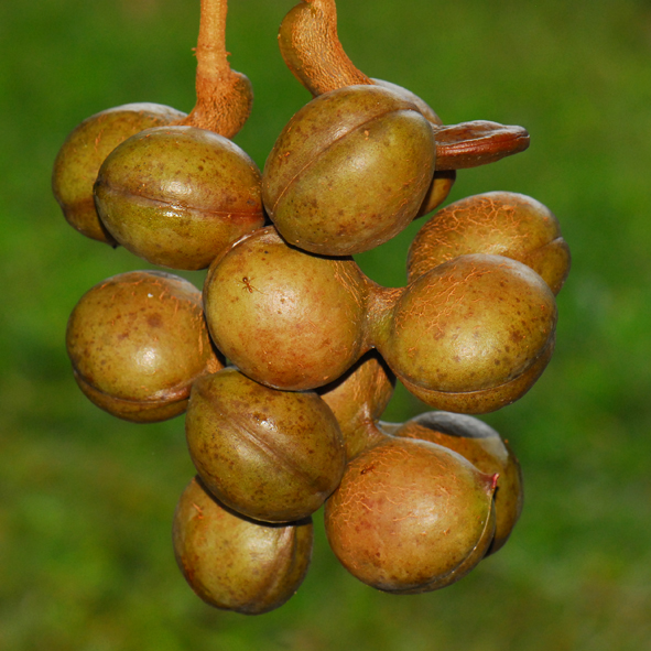 - ผล กว้างถึง 5 ซม. ยาวได้ถึง 25 ซม. บิดเป็นเกลียวหรือเป็นวง รูปคล้ายสายเข็มขัด พองตรงเมล็ด จักเป็นพูลึกระหว่างเมล็ดที่ขอบด้านหนึ่ง สีน้ำตาลเข้มหรือน้ำตาลอมม่วงด้านนอก ด้านในสีออกเทา เนื้อหนาคล้าย หนังบาง เกลี้ยง แก่จัดแตกตามขอบด้านเดียวและร่วงเป็นชิ้นๆ เมล็ด ยาว 2.8-3.5 มม. สีน้ำตาลแดง กลม มีกลิ่นคล้ายกระเทียมเมื่อทำให้แตก